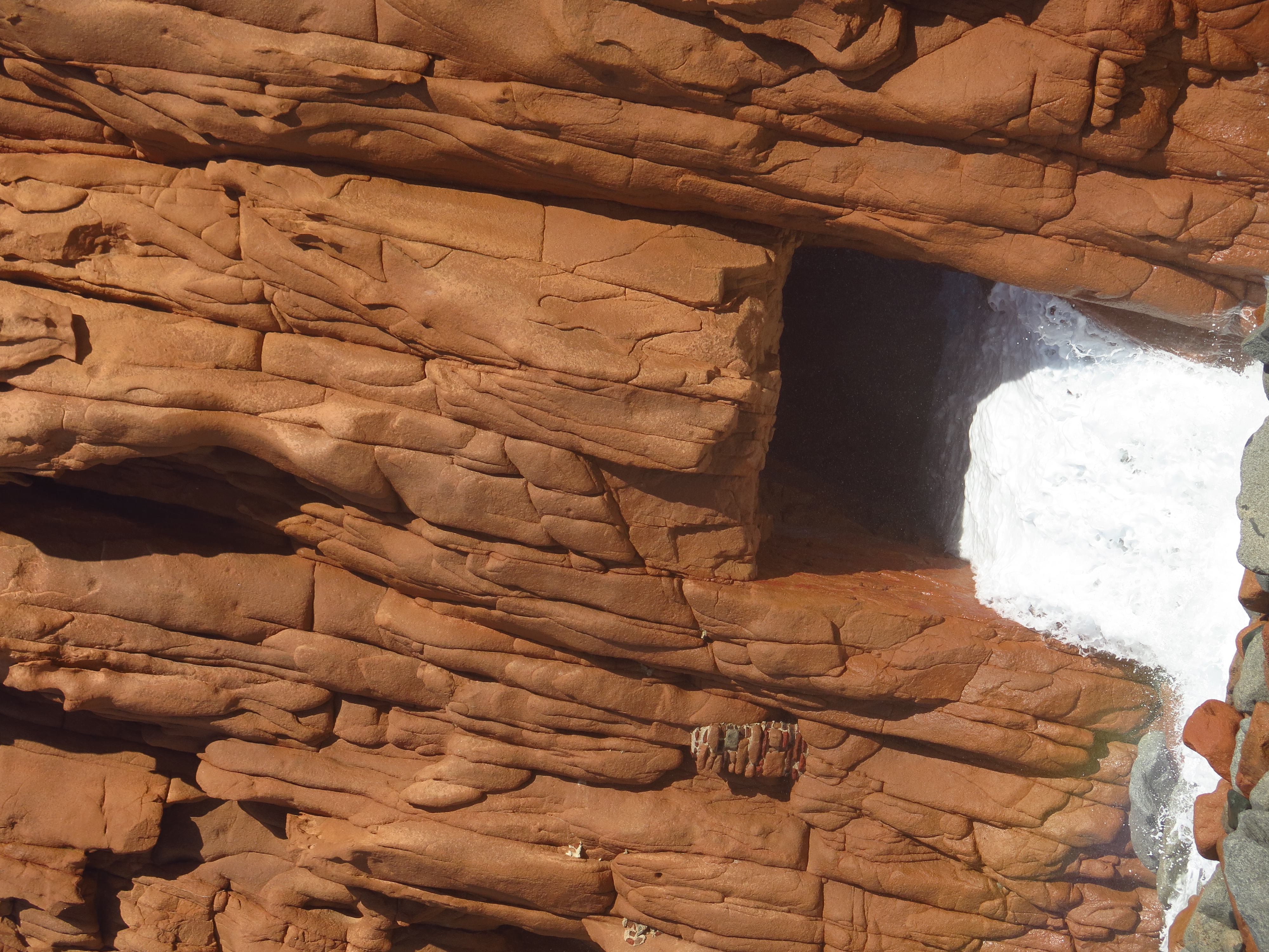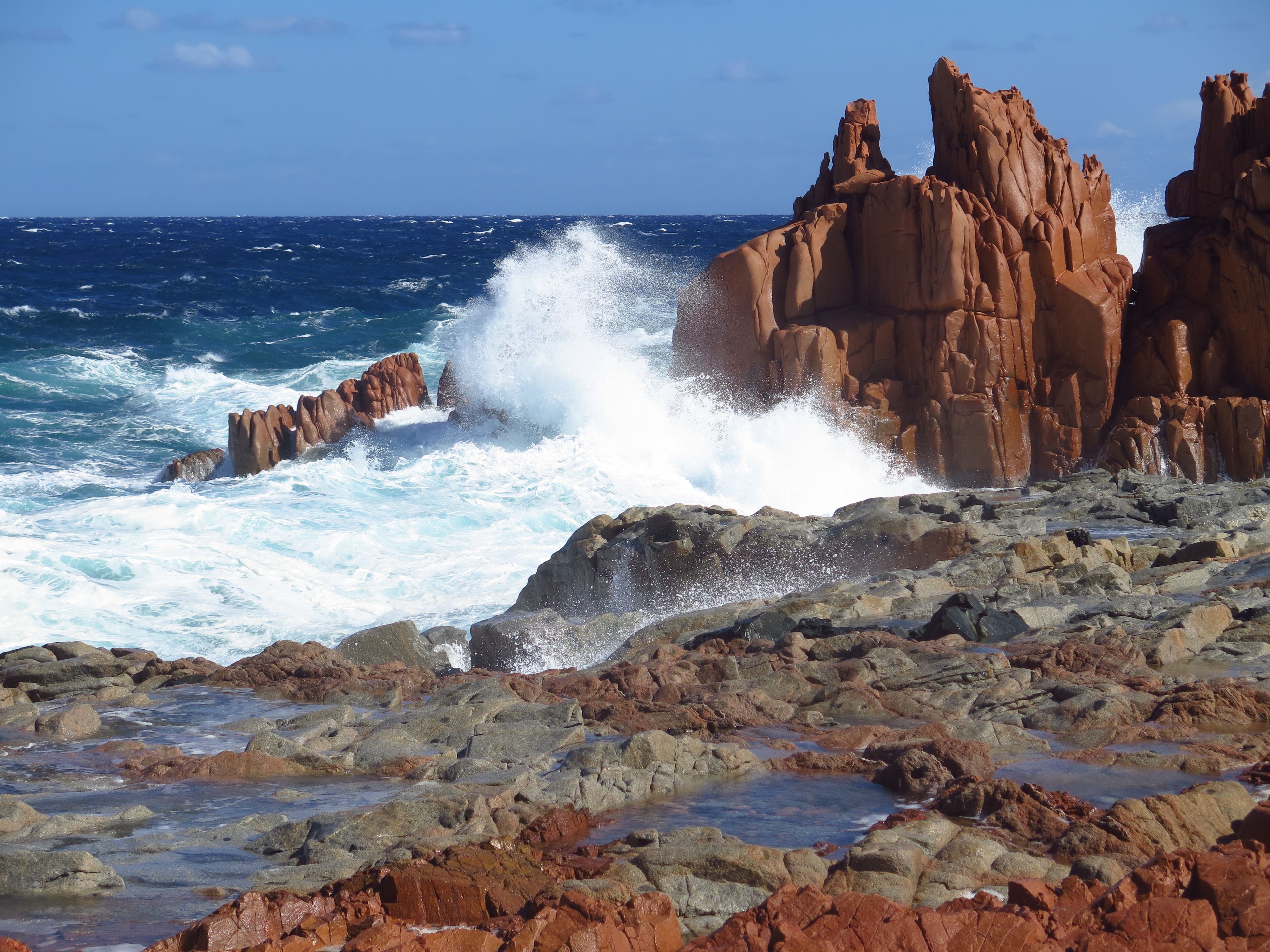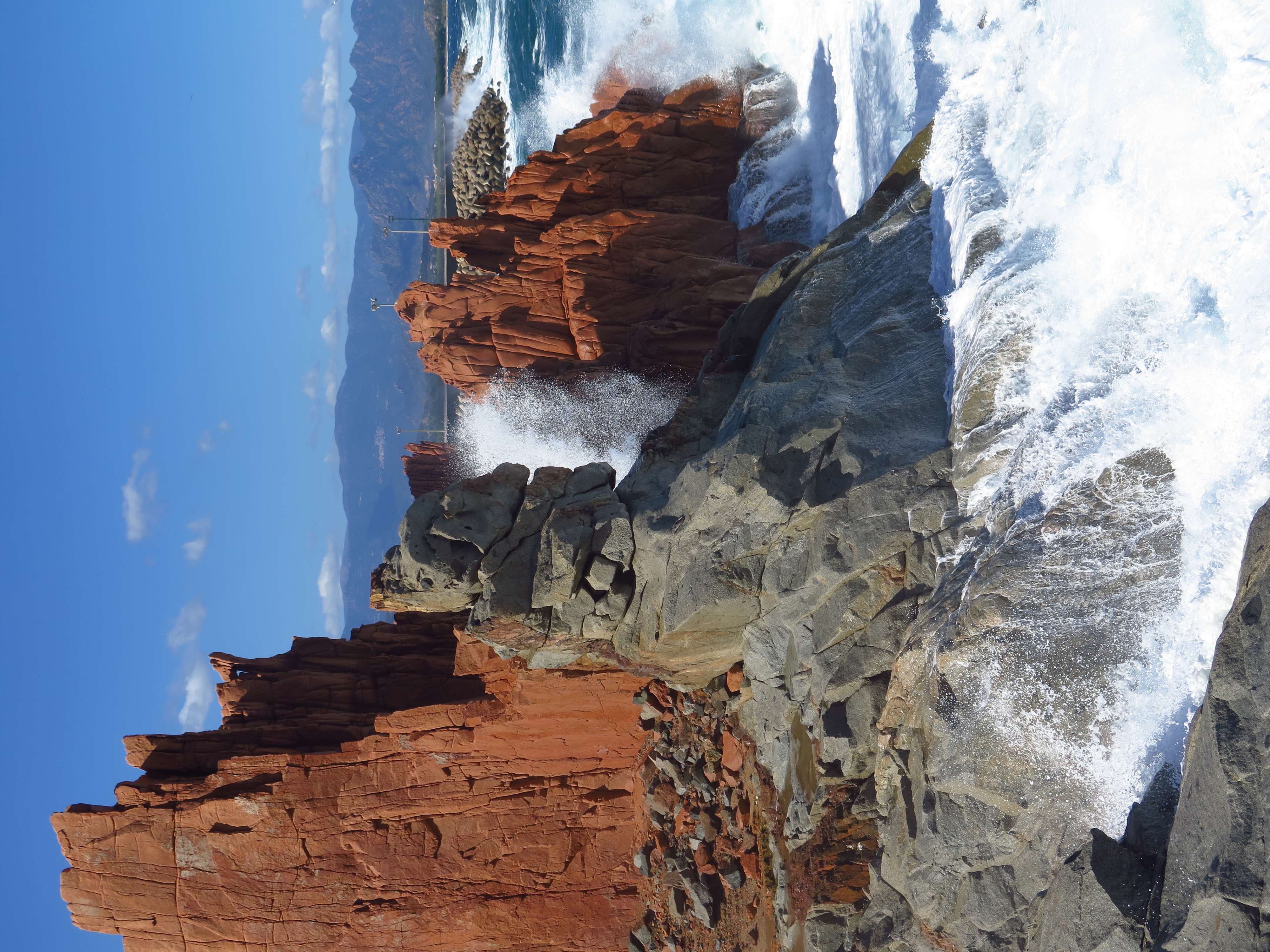 So gegen 12:00 sind wir weiter nach Arbatax gefahren (auch ca. 1 Std.). Der Wind pfeift ganz ordentlich. Die Frisur ist hin. Dafür ein sehenswerter Hafen und wahnsinnige Klippen mit irrem Getöse. Das Meer bewegt sich lautstark und mit voller Wucht gegen die Steine. Die Brille ist beschlagen. Doch bei blauen Himmel ist ein tolles Farbenspiel zu sehen.